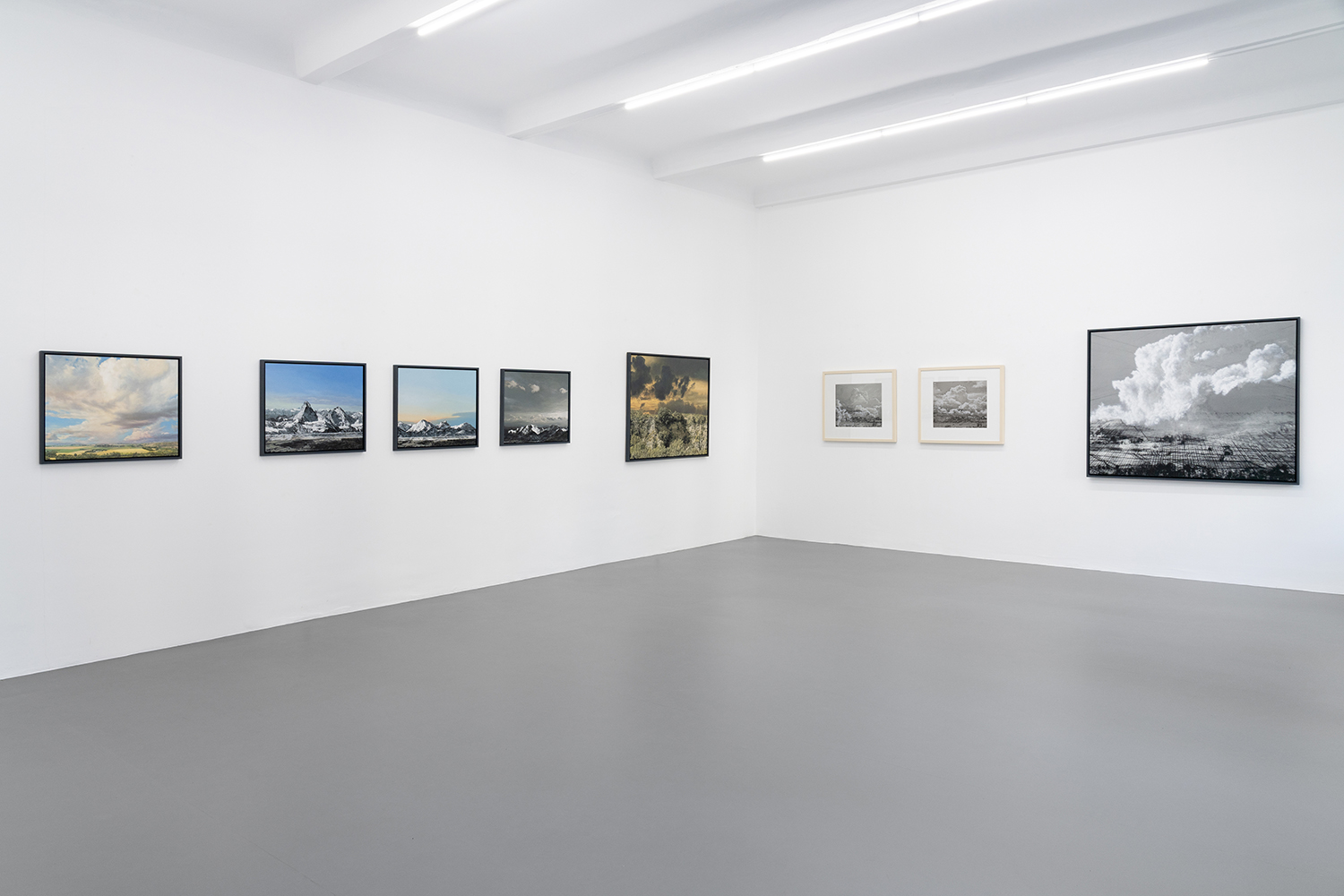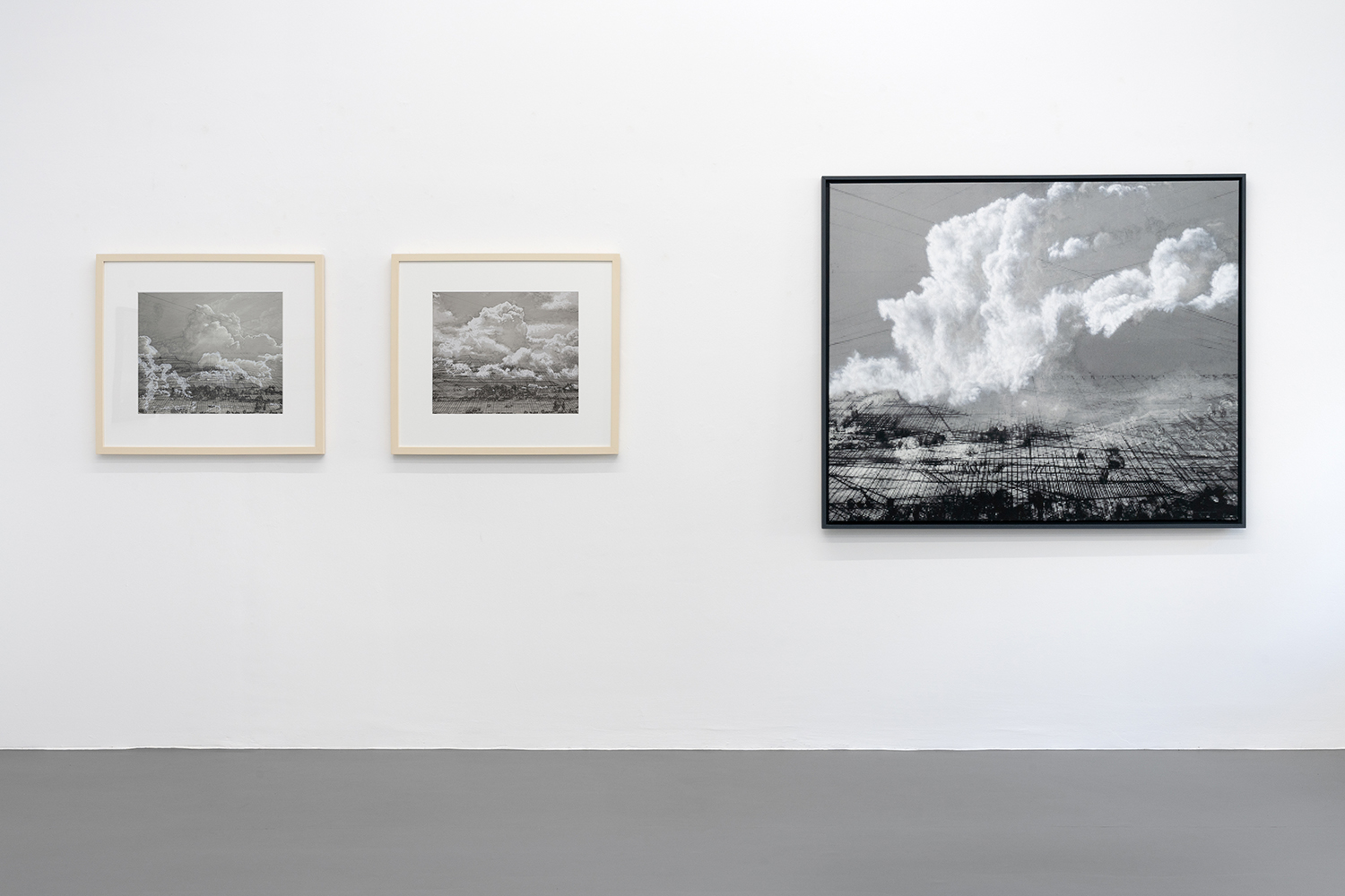 In der mit dem Pfalzpreis für Bildende Kunst und dem Wilhelm-Morgner-Preis ausgezeichneten Serie monumentaler Überblickslandschaften kombiniere ich Wolken- und Erdfragmente mit perspektivisch aufgefächerten Gitternetzen, die sich in digitale Pixel auflösen und quasi zu Netzlandschaften, zu Netscapes mutieren. More →