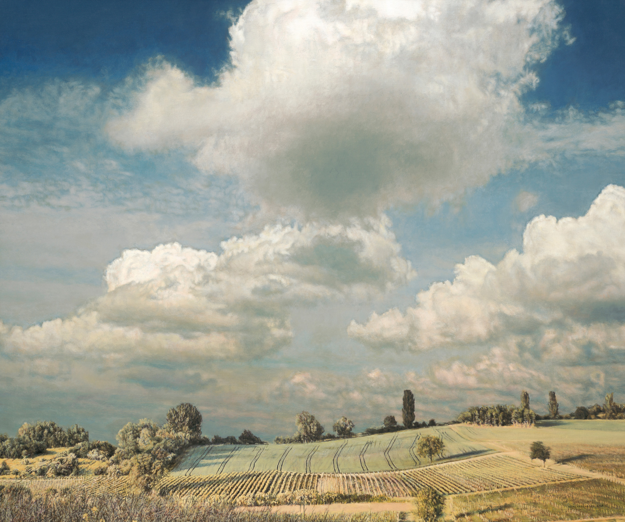 Unterwegs in der Natur mit Kamera und Drohne habe ich Veränderungen in Gelände, Bewuchs und Himmelsraum der teils breiten Täler und der bis zu 320 Meter hoch gelegenen Plateaus der tertiären Schichtstufenlandschaft genau beobachtet, analysiert und in Aufnahmen und Skizzen bewusst gemacht. Von der Erkundung der vorwiegend durch Wein- und Ackerbau geprägten Kulturlandschaften mit ihren weiträumigen, gerade im Winter prägnanten grafischen Mustern oder der geologischen Aufschlüsse mit ihren freigelegten Spuren der Erdgeschichte habe ich neue Vorlagen für meine Landschaftskonstruktionen gewonnen.